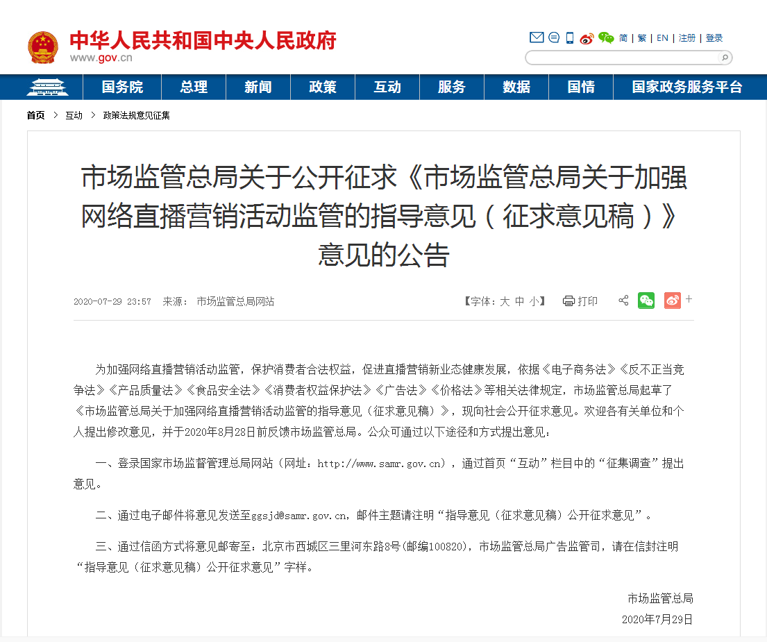 7月29日下午,市场监管总局发布了《市场监管总局关于加强网络直播营销活动监管的指导意见(征求意见稿)》(以下简称《意见》),其中明确提出,直播内容构成商业广告的,主播应履行代言人的责任与义务。
