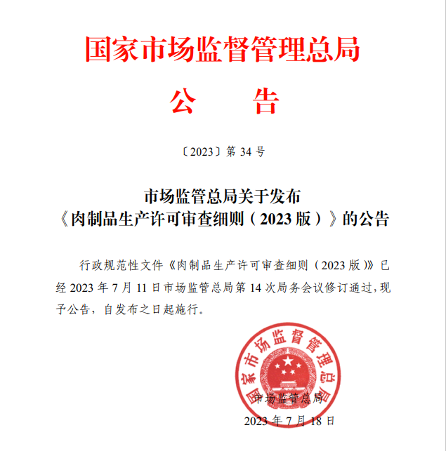 SMAR关于发布 《肉制品生产许可审查细则(2023版)》的公告